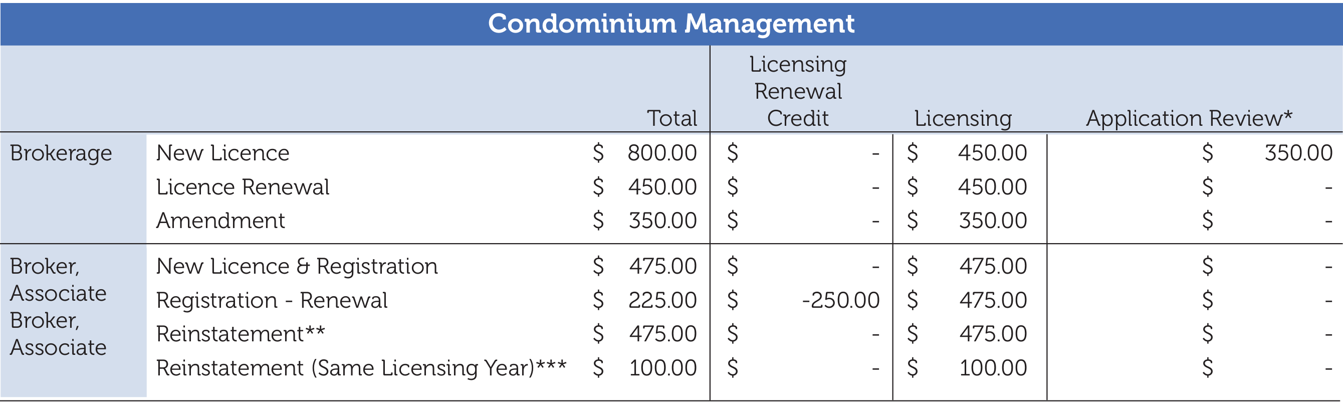 NOTE: Effective July 1 through to September 30, the licensing fee for each individual class of licence is reduced to $275. The REIX premium, if applicable, is also reduced to $100. The fee reduction applies to any industry professional who has not been registered in the current licensing year. The Assurance Fund levy does not change.